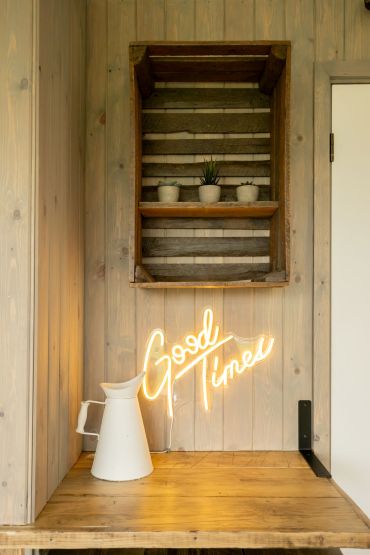 With it`s bright white walls and rustic elements throughout, it has turned into a very successful space and a hit with the guests!