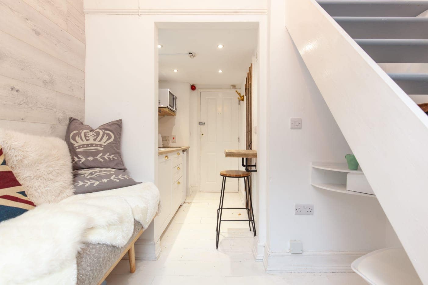 This holiday let studio is a good example of how to make use of every possible nook and cranny in a small space and to give holiday makers a comfortable experience with enough room to hang their clothes and relax and not feel cramped.
